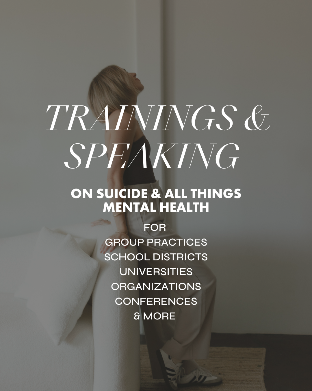 Looking for a speaker or trainer for your group practice, school district, panel, business, workshop, podcast, organization, or live event? Let's connect.